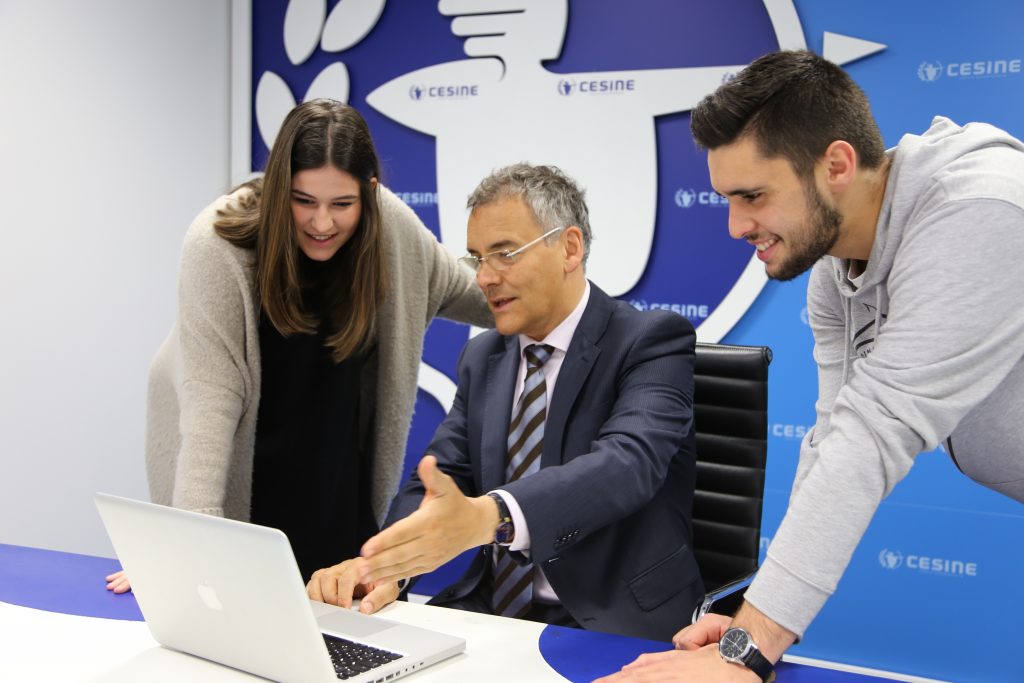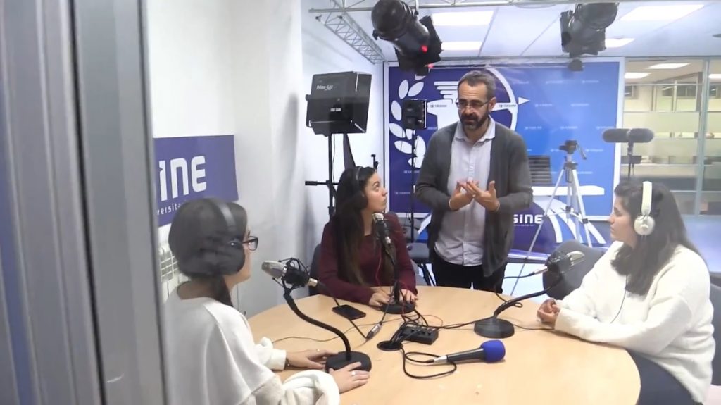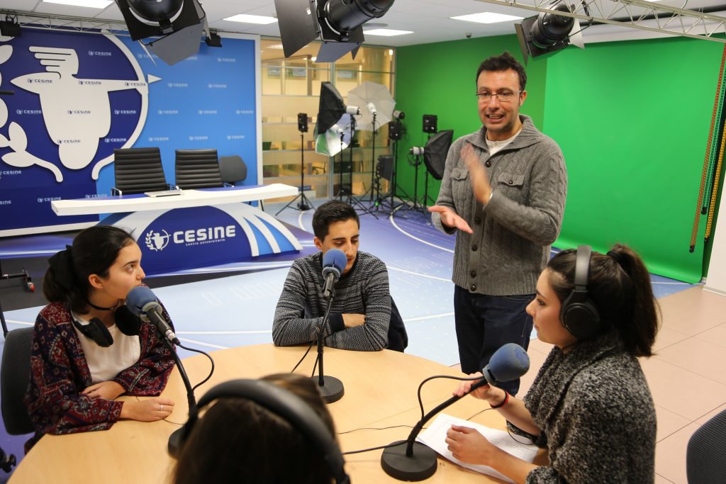 Jaime del Olmo, presentador de "Las Mañanas" y Deportes COPE Cantabria, durante una actividad de radio con alumnos del Grado en Periodismo. El Grado en Periodismo y Redes Sociales de CESINE, considerado uno de los más modernos de España, permite a los alumnos realizar proyectos periodísticos desde el primer curso, de la mano de sus profesores, reconocidos profesionales en activo de diferentes ámbitos de la comunicación. Una formación eminentemente práctica que implica a los estudiantes en actividades y proyectos de radio, televisión, redacción, redes sociales o realización audiovisual que desarrollan las competencias y habilidades requeridas actualmente a un buen periodista.